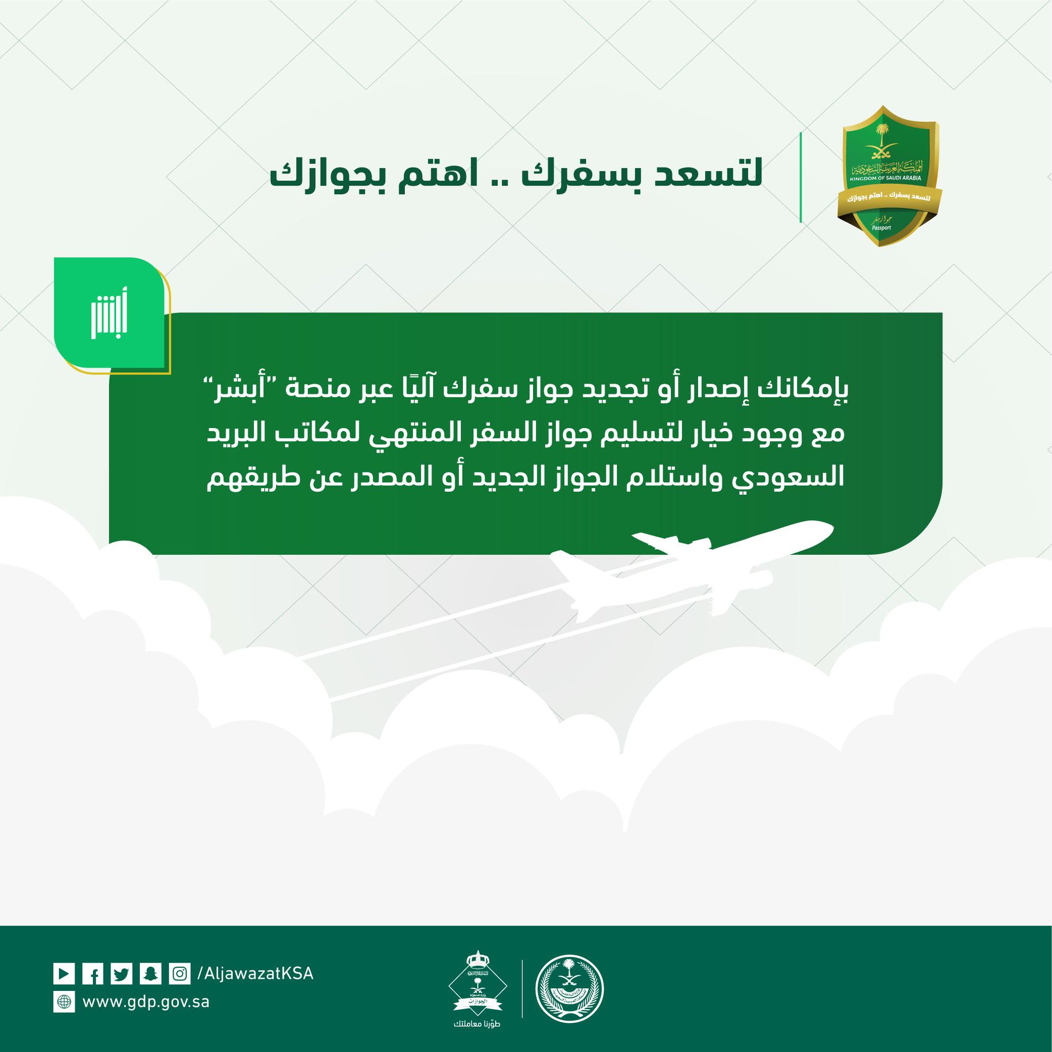 الجوازات السعودية على تويتر بإمكانك إصدار أو تجديد جواز سفرك آلي ا عبرمنصة أبشر مع وجود خيار لتسليم جواز السفر المنتهي لمكاتب البريد السعودي واستلام الجواز الجديد أو المصدر عن طريقهم لتسعد بسفرك اهتم بجوازك Https T Co Xjmulzfvim